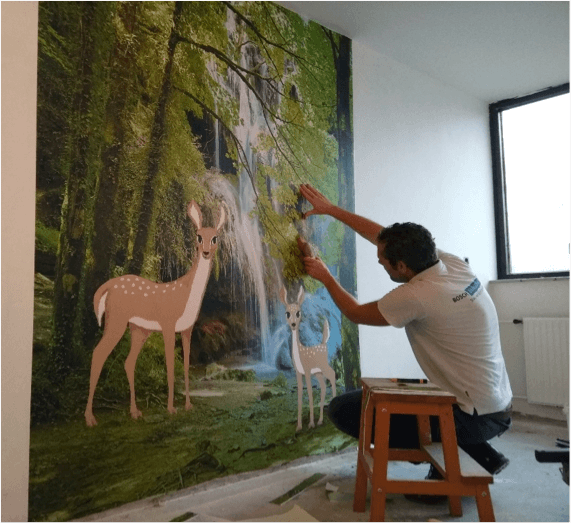 Het effect van een wallprint is overweldigend. Dit komt doordat het één groot beeld aaneen is, wat een strak resultaat geeft. Het naadloos plakken is hiermee van de baan, maar toch is een wallprint – door die enorme afmeting – niet iets wat u zelf ‘even’ plakt. Zo mochten wij de onderstaande dertien meter(!) lange wand voorzien van een compleet bos, dit is dus helemaal naadloos en uit één stuk.