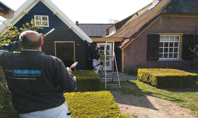 Alle aansluitingen op beglazing is hersteld, denk hierbij aan het ambachtelijk aanstoppen met stopverf. Ook hebben we gelijk houtrotsanering uitgevoerd aan de luiken en kozijnen waar dit nodig was. Waarna de boerderij weer in prachtige ouderwetse kleuren is geschilderd met hoogglans door onze schilders. Wij mochten alle luiken, boeidelen, kozijnen, bakhuus en de 2 grote deeldeuren aan de achterzijde van de boerderij weer als een spiegel schilderen in de lak zetten!